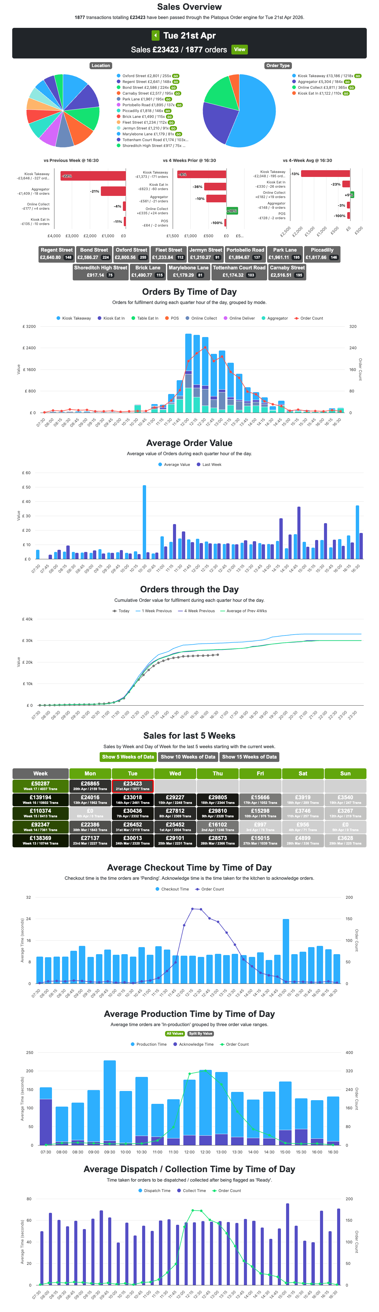 Location managers see their own site in full detail — revenue, order mix, timing, week-on-week comparisons — with no visibility of other locations. Directors and MDs see the whole estate in the same depth. The same tool, the same live data, working as a briefing at every level of the business. Most of our customers' MDs check it every evening. Many check it several times throughout the day as well.